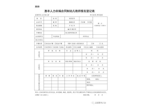 為滿足我市公辦幼兒園師資需求,我公司面向社會公開招聘一大批非事業(yè)編合同制幼兒教師,以勞務(wù)派遣的方式與用人單位進行勞動力資源開發(fā)合作。現(xiàn)將有關(guān)事項公告如下:一、招聘人數(shù)及崗位我市招聘非事業(yè)編合同制幼兒教師50名,具體崗位在選崗前公示。二、招聘方式通過第三方勞務(wù)公...
